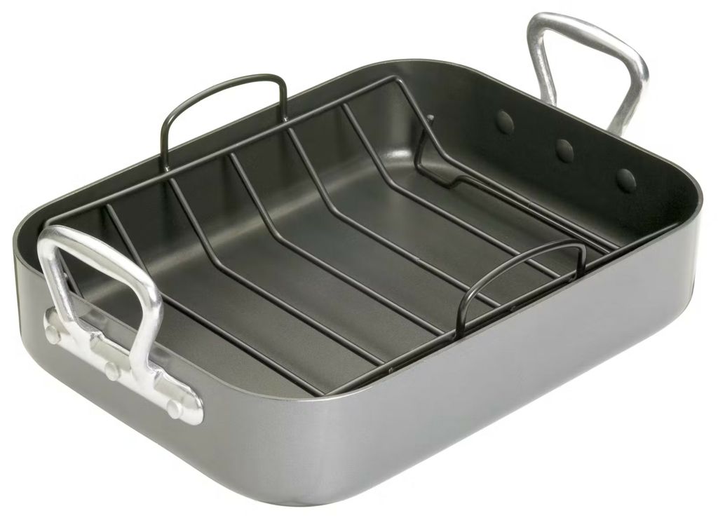 The perfect choice for roasting a beautiful joint of meat, this non-stick roasting pan features a removable roasting rack that easily allows the fat to drain away for healthier cooking. Ensure you have a secure grip with heavy duty hinged handles, ideal for use on all heat sources excluding induction. The roasting pan and rack forms part of the MasterClass award winning bakeware collection that guarantees many years of satisfying cooking and baking.