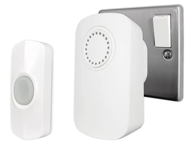 Plug into any 13A socket around your home. Wireless range of up to 100 metres. 26 different chimes with volume control. Water resistant bell push with adhesive pad for easy and secure attachment. Bell push powered by 1 x CR2032 button cell battery.